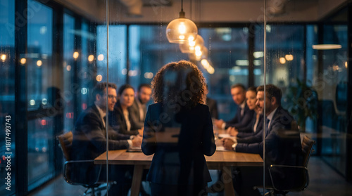 leadership, business, strategy, meeting, woman, corporate, management, teamwork, presentation, success, ambition, communication, collaboration, discussion, executive, planning, confidence, power, decision, briefing, office, boardroom, conference room, team, group, people, colleague, businesswoman, manager, ceo, boss, speaker, night, dark, modern, glasses, table, silhouette, indoor, working, talking, professional, serious, formal, work, career, job