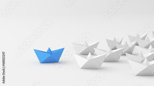Leadership concept, blue leader boat, leading whites. 3D Rendering.