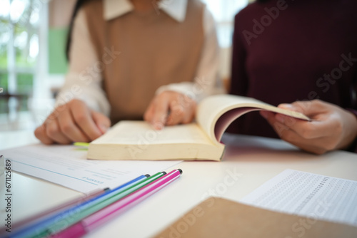 Learning with friends Young students campus.High School Tutor for examining helps school homework together with friend catching up and learning
