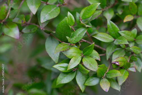 Leaves of Common Myrtle, Myrtus communis. It is native across the Mediterranean Region. Background of myrtle tree leaves.