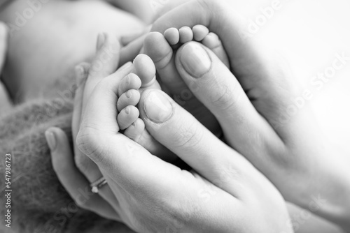 Legs, toes, feet and heels of a newborn. With the hands of parents, father, mother gently holds the child's legs. Macro photography, close-up. Black and white photo. High quality photo