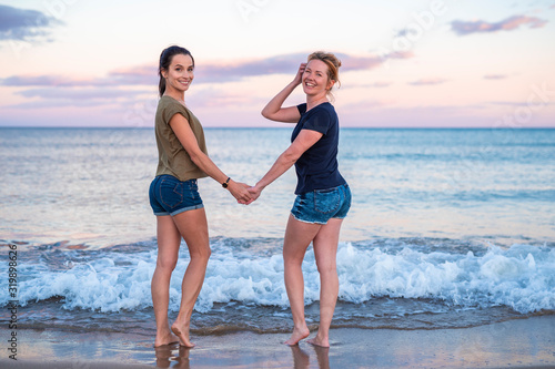 leisure and friendship concept - two happy smiling young women or best friends at seaside holding hands at sunset standing in water