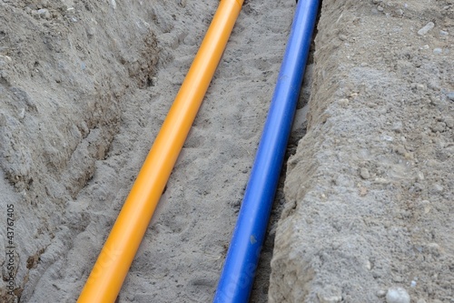 natural gas, drinking water, line, tubing, gas, water, yellow, blue, dig, canal, open, laying, laying, construction, under construction, supply, hookah, abreast, plastic, sand, infrastructure, roadwork, connection, installing, version, water supply, security, environment, energy