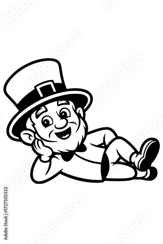 leprechaun, elf, gnome, cartoon, lying, relax, resting, shamrock, clover, ireland, irish, saint, patrick, holiday, lucky, mascot, vector, black, white, outline, clean, bold, minimalist, vinyl, apparel, print, design, character, silhouette, art