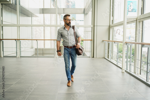 Lifestyle of man hipster freelancer standing and holding laptop at office terminal corporate, professional freelance man concept
