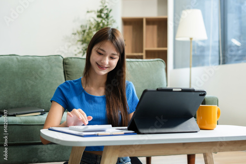 lifestyle of office workers, Woman calculating expenses and using laptop. Home office. Work place. Lifestyle.