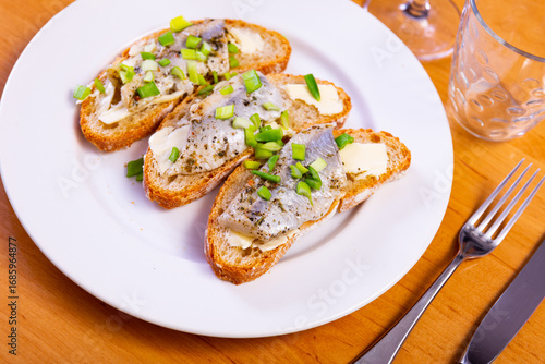 Light and healthy breakfast - sandwiches of white bread and herring, decorated with ring of green onion. Light and hearty breakfast, healthy food, easily digestible protein