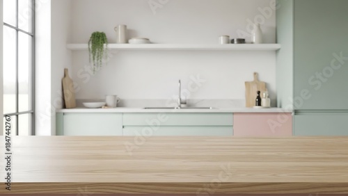 Light ash wood kitchen countertop with pastel contemporary kitchen background, fresh morning daylight, bright and airy interior stock photography