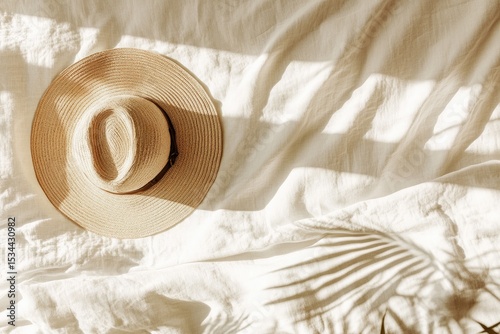 hat, straw, linen, white, beige, sunlight, shadow, natural, warm, soft, texture, summer, elegant, simple, fashion, accessory, detail, style, design, minimalist, decorative, home, interior, decor, relaxation, vacation, holiday, travel, inspiration, calm, peaceful, gentle, light, shadow, pattern, drape, fold, natural light, daylight, cream, pale, photo, still life