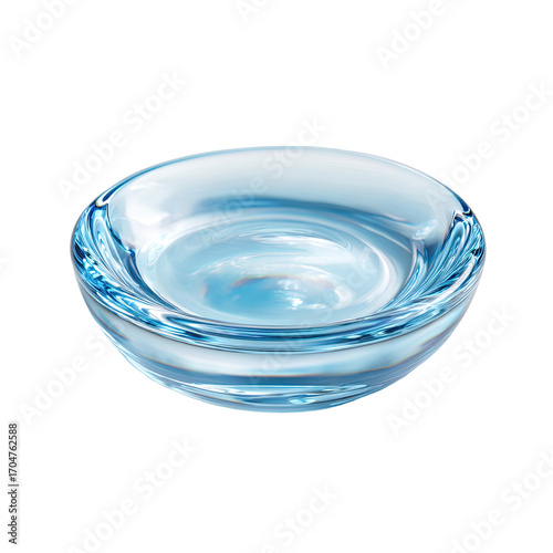 Light blue, round, shallow glass bowl. A clear, translucent, light azure bowl, slightly concave, with a smooth, rounded edge
