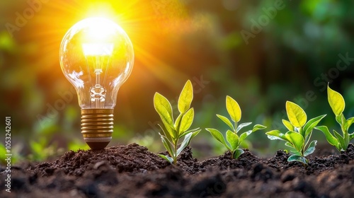 Light bulb among growing plants, symbolizing innovation and sustainability.