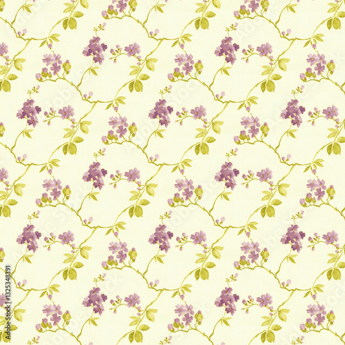 Light floral pattern with purple blossoms and green leaves. Elegant seamless design suitable for spring textiles and soft backgrounds.