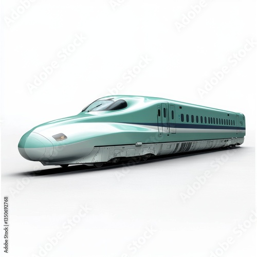 Light green high speed train on white background, sleek design, modern transportation, angled view.