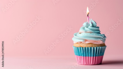 Light pink and light blue cupcake with one candle