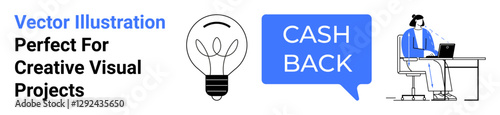Lightbulb for creative ideas, cashback in speech bubble, and woman working on laptop. Ideal for productivity, financial incentives, e-commerce, innovation, creativity, marketing flat landing page