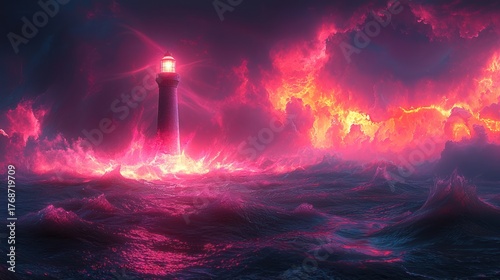 lighthouse, storm, sea, ocean, wave, fire, cloud, night, dark, light, beam, hope, danger, dramatic, fiery, apocalyptic, glow, pink, red, purple, intense, turbulent, powerful, majestic, ominous, fantasy, surreal, mysterious, vibrant, energy, colours, sky, water, landscape, nature, weather, beauty, artistic, illustration, digital, art, graphic, image, scene, view, perspective