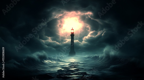 lighthouse, storm, sea, ocean, night, dark, cloud, light, hope, guidance, beacon, wave, dramatic, moody, mysterious, power, strength, nature, weather, sky, fog, silhouette, tower, seacoast, coastline, rocky, water, wind, intense, bright, gloomy, path, illumination, ray, beam, rock, element, landscape, fantasy, digital, art, image