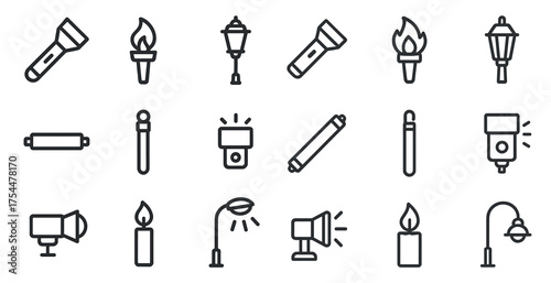 lighting, flat, solid, outline, vector, icon, set, light, bulb, torch, lantern, flashlight, lamp, street light, led, electricity, energy, design, concept, modern, object, decoration, brightness