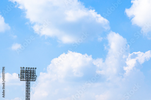 Lighting tower of stadium on sky and cloud background.