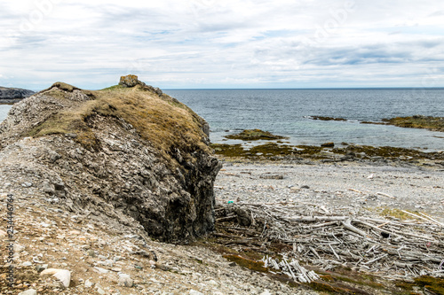 Limestone cliffs, rock and driftwood strewn beaches and flora in the hills in Bellbuns, Newfoundland, Canada