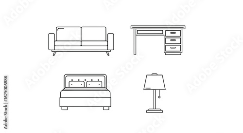 Line art icons of furniture sofa, desk, bed, and lamp. Minimalist design on white background.