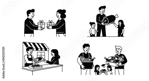 people, turkey, presentation, serving, black, white, illustration, vector, graphic, design, food, meal, holiday, thanksgiving, dinner, celebration, formal, attire, suit, dress, tray, roast, meat, plate, offering, gathering, event, minimalist, simple, isolated, monochrome