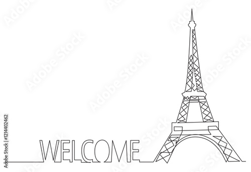 Line art of the Eiffel Tower with the word "Welcome." Modern and clean design for travel, tourism, or French-themed projects. Ideal for postcards, banners, or websites.