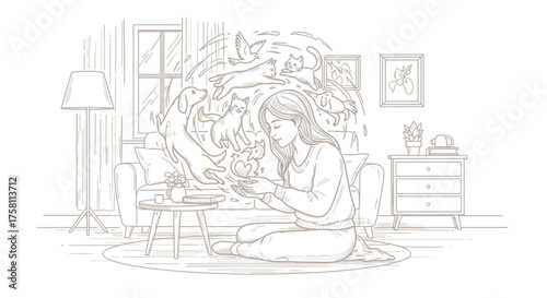 Line Art Woman Interacting with Playful Abstract Pets in Cozy Home