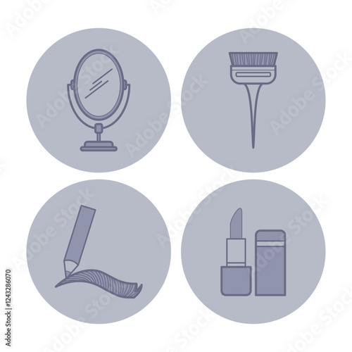 Line icons of essential beauty tools. Mirror, brush, pencil, and lipstick. Makeup concept