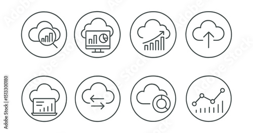 Line style icons of cloud technology: cloud analytics icon, data dashboard in cloud, chart from cloud source, metrics upload symbol, monitoring cloud use, cloud traffic icon, insight ring, usage