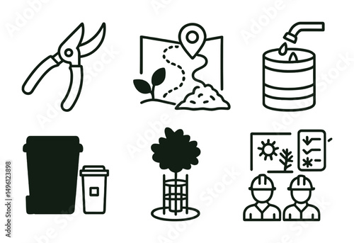 line, style, icon, green, maintenance, pruning, tool, watering, route, map, mulch, pile, refill, barrel, bin, station, tree, guard, icon, seasonal, checklist, park, crew, symbol