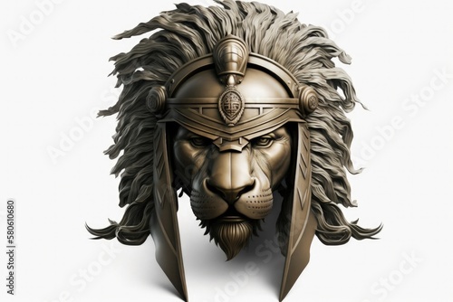 Lion head illustration with spartan helmet, white background. Generative AI