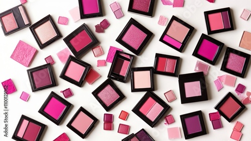 Lipsticks, eyeshadow palettes, and blush compacts scattered on a white background, vibrant colors, flat lay arrangement