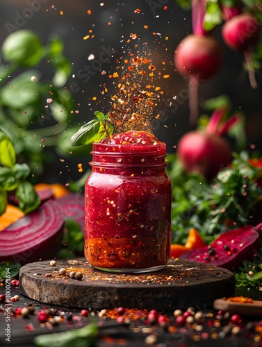 Liquid sauce on cutting board with beets and various spices flying around veggies in background