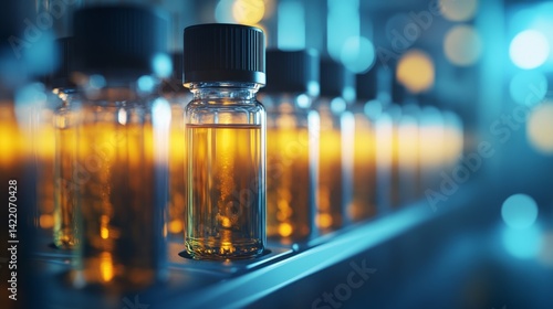 liquid vials, black caps, soft blue.