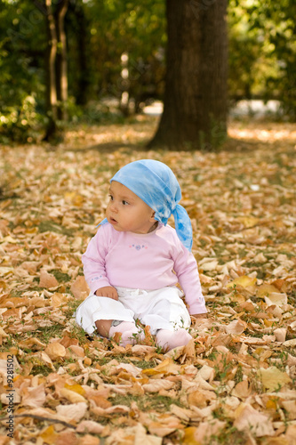 baby, children, children, 1, person, human, face, hand, hand, ear, european, month, young, little, sitting, comfortably, glad, childhood, 1, portrait, leaf, leaf, orange, autumn, fall, shawl, grass, park, wood, green