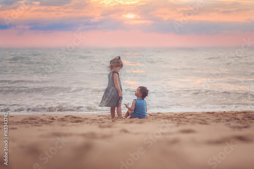 Little boy and girl on the beach at sunset. Summer, ocean, paradise. Outdoor.