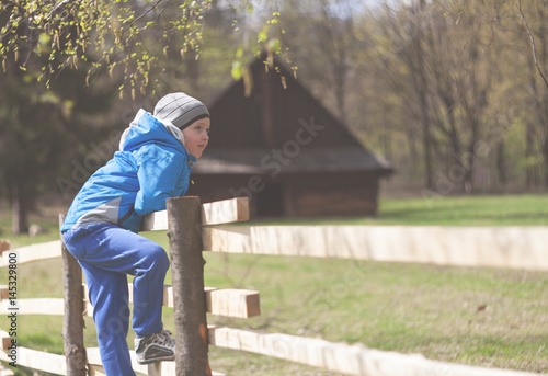 Little boy on fence in farm during early spring time