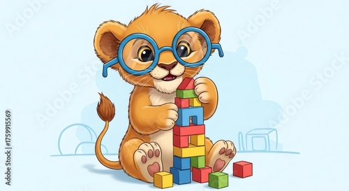 Little cartoon lion wearing glasses and playing with colorful building blocks. Pediatric ophthalmology and vision correction concept.