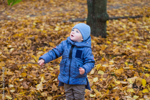 Little child boy 1 years old walks in the park on fallen colorful leaves in autumn day