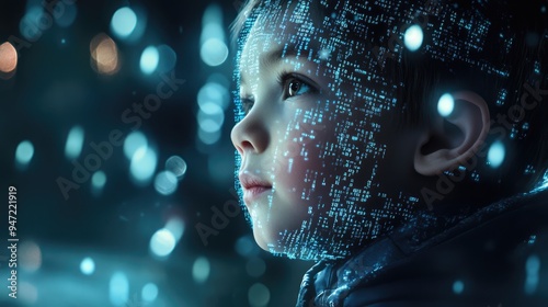 Little child with digital code data overlay, cyberspace and information technology of the future. Ai education and cybersecurity
