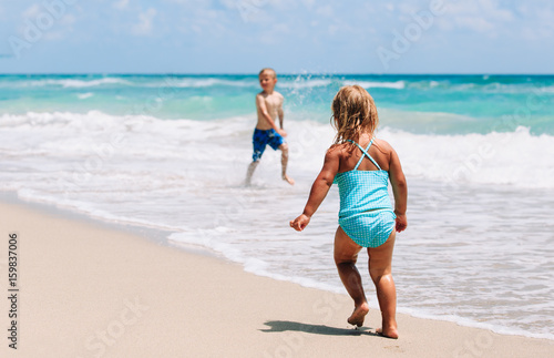 little girl and boy run play with waves on beach