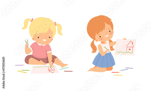 Little Girl Drawing on Paper with Colored Pencil Sitting on the Floor Vector Set