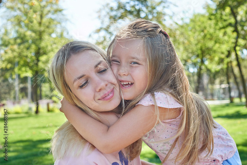 little girl hugs mom in the park