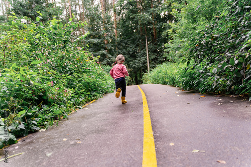 children, girl, children, childhood, summer, small, female, park, spring, autumn, pink, caucasian, cute, children, walk, weather, forest, yellow, jean, stripes, middle, road, path, backview, copy space, track, landscape, person, people, alone, young, away, runs, daughter, pink sweater, fast, afternoon, maple leaf, look, portrait, health, 1, smiling, sporty