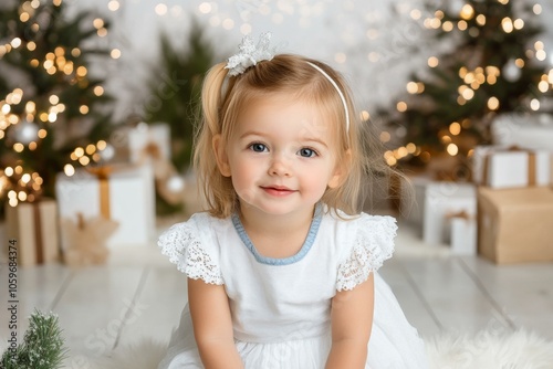 Little girl sitting on floor in front of Christmas trees, surrounded by festive decorations, warm lights.