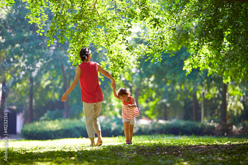little girl with her mother in the sunny park