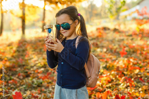little girl with hourglass surrounded by autumn foliage