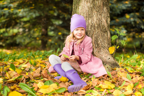 Little happy girl in autumn park on sunny fall day