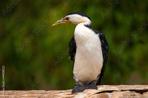 Little Pied Cormorant, Microcarbo melanoleucos, water bird from Australia. Detail portrait of cormorant with back sun light during evening. Wildlife scene from nature.